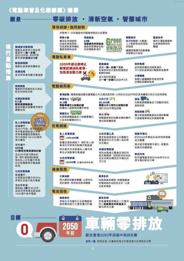 在2021年《香港電動車普及化路線圖》中,香港政府將會於2035年或以前停止新登記燃油私家車,包括混合動力車。為鼓勵更多人使用電動車,政府亦推出電動私家車首次登記稅寛減和「一換一」計劃。