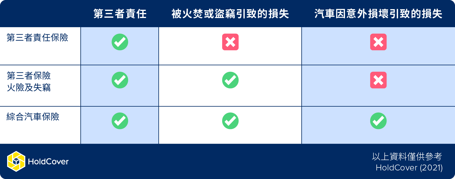 第三者責任保險 – 又名「三保」。顧名思義保障第三者的財物損毀及人身傷亡,但大部份都不保駕駛者人身傷亡及財物損毀。