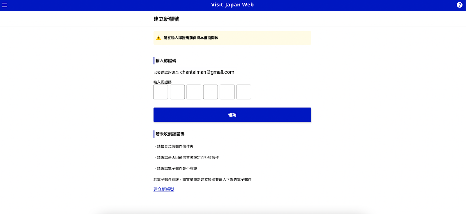需要特別注意的是,在檢查郵件並輸入認證碼時, Visit Japan Web 的頁面需保持開啟。如果頁面被關閉,認證碼將失效,屆時需返回主畫面點擊 「重新取得認證/忘記密碼」,再次輸入電子郵件地址以重新接收認證碼。