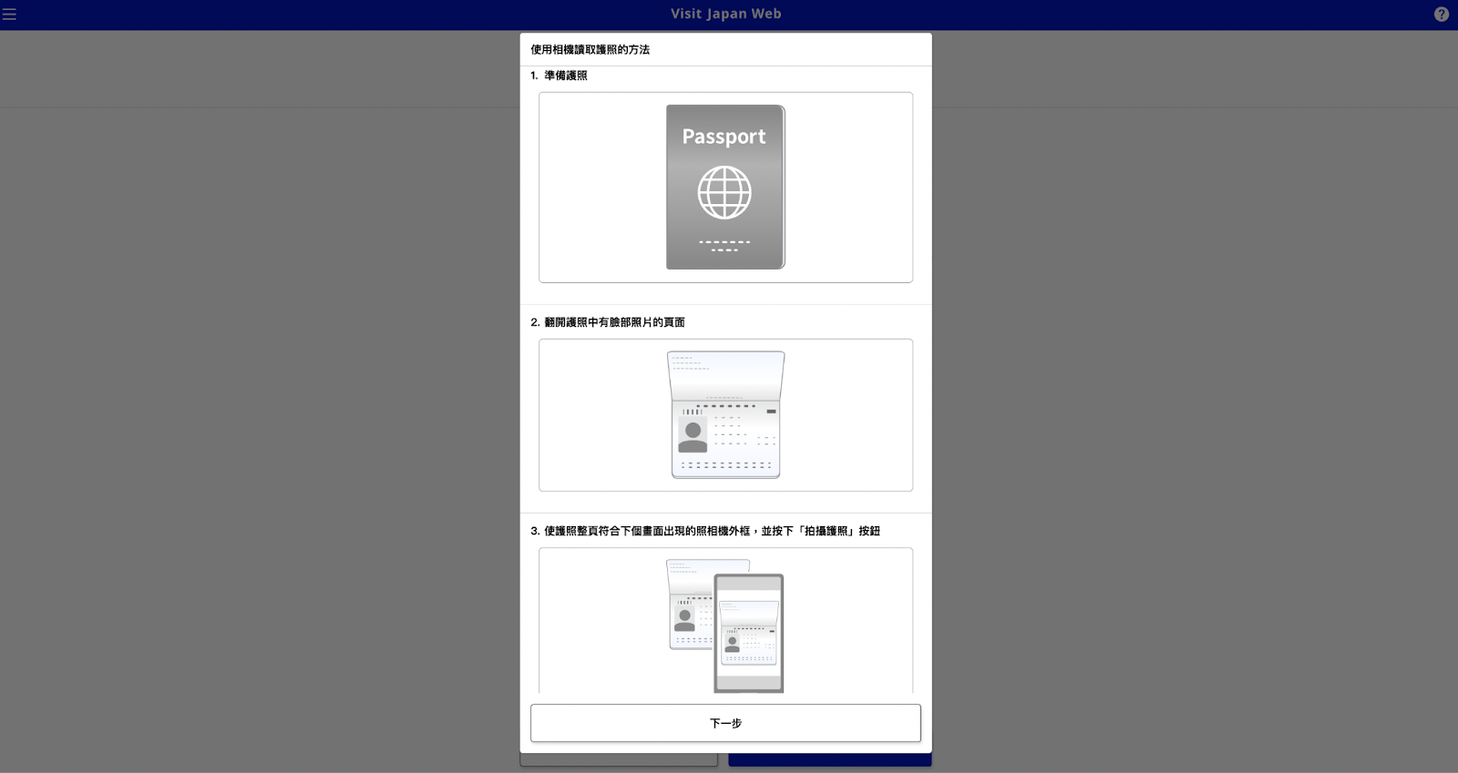 接下來,系統將要求您輸入護照上的本人資料。您可以選擇手動輸入或使用相機掃描護照來完成基本資料填寫。此外,後續還需依提示,填寫在日本的聯絡處資訊。