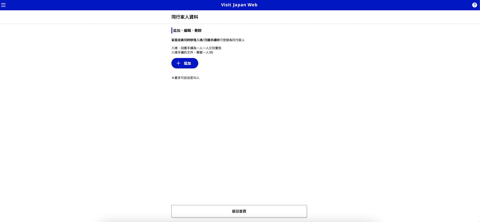 - 點選 「追加」 按鈕,開始新增家人資料。每人最多可登錄 10 位同行家人。